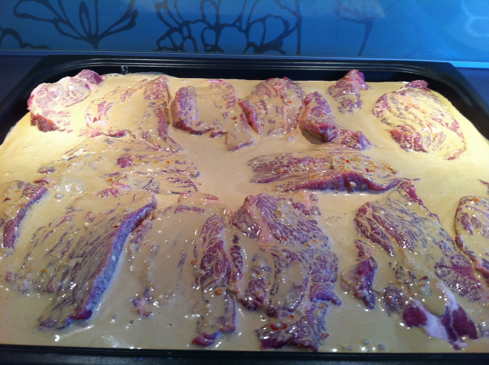Lägg det råa köttet i långpannan. Vispa ihop övriga ingredienser och häll detta över köttet. Blandningen ska knappt täcka köttet. Skeda sås över köttet, så alla köttbitarna dränks in.