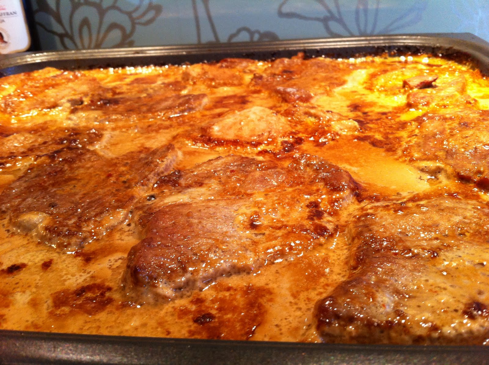 Många gånger, lite varstans, har jag sett lite olika receptvarianter på ugnskotlett. Här kommer min variant på en välsmakande ugnskotlett. Det som är så bra är att man kan experimentera med smakerna gång från gång. Grunden är grädde, japansk soya och ev creme fraiche. Krydda gräddblandningen med vad du vill. Gör gärna i långpanna, så har du mat i flera dagar. Bra matlådemat också. Välj vilket kött du vill, med eller utan ben, fläskkotlett, karrékotlett, kycklingfilé o s v. I det här receptet valde jag benfri karrékotlett. Säljs ofta i storpack i butikerna.