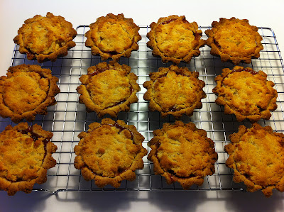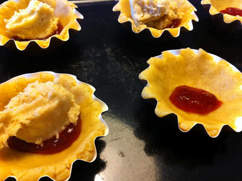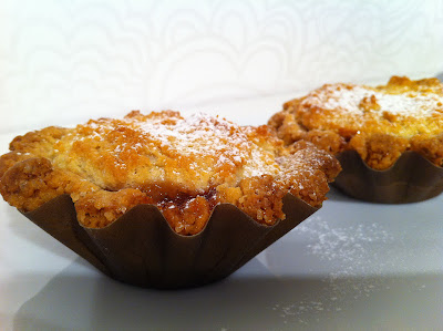 Tryck ut degen i formarna. Lägg knappt en matsked sylt i varje form. Fyll därefter formarna med fyllning. Grädda i mitten av ugnen i cirka 30 minuter. Låt svalna. Dofta florsocker över kakorna.