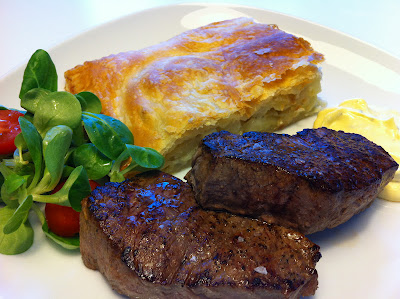 Bryn köttet hastigt i smör i het stekpanna så att det får fin färg. Lägg det i en smörad ugnsform. Stek i mitten av ugnen tills innertemperaturen är 55-58 grader (rosa), cirka 10 minuter. Använd en stektermometer. Tag ut köttet och linda in i aluminiumfolie, låt vila i 10 minuter.