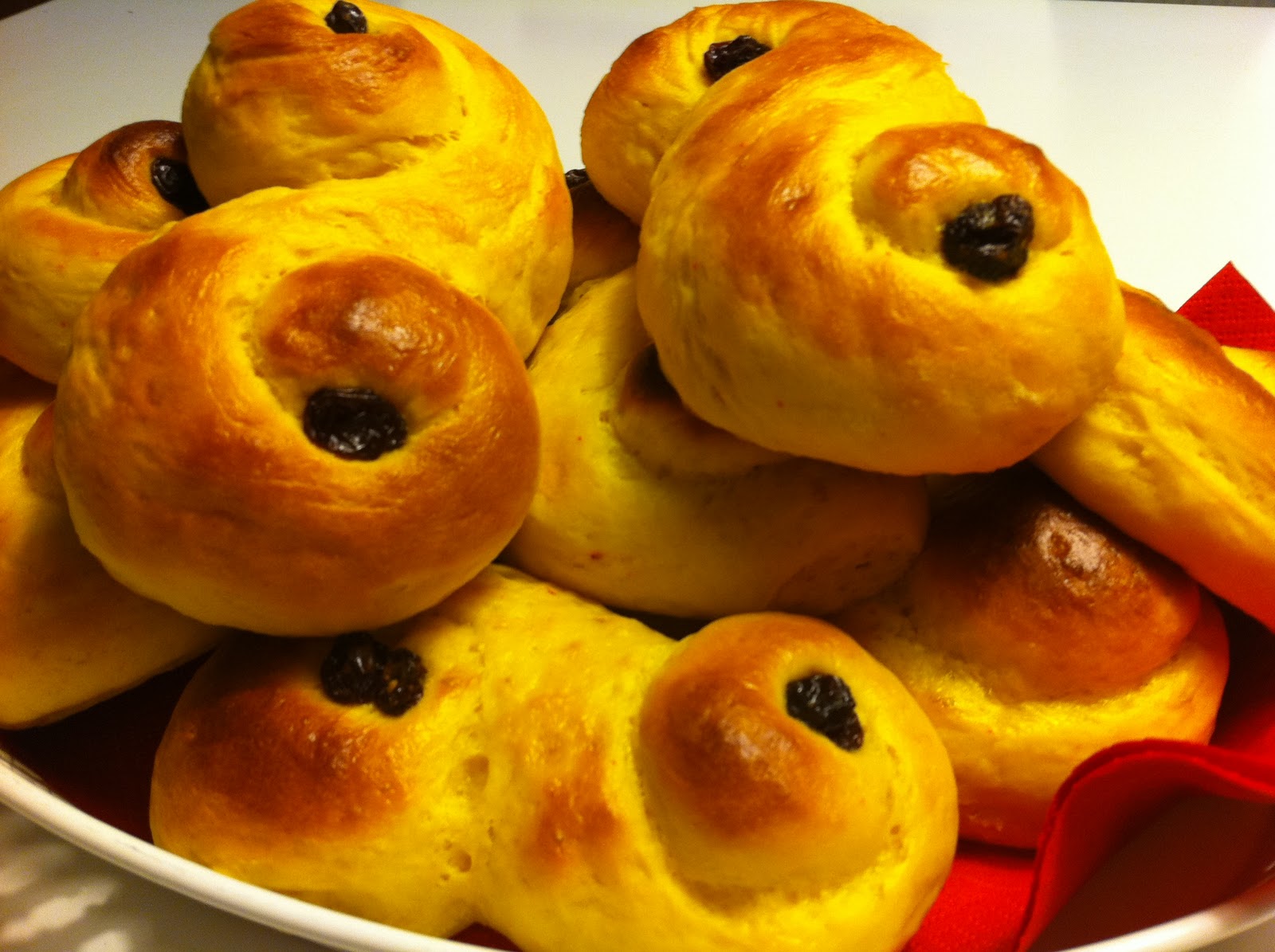 Dessa är bakade utan Kesella, (hur gjorde man förr i tiden när Kesella inte fanns… 😉 )? Jag hade ingen Kesella hemma och dessa är minst lika saftiga, se bara till att degen är lösare än vanlig bulldeg. Saffran torkar nämligen ut degen. HÄR finns recept på lussekatter med Kesella, ett favoritrecept.