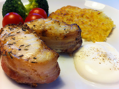Lagade detta igårkväll tillsammans med oxfilé, baconrullad sparris, sallad och spröd brysselkål. Såsen förberedde jag tidigare på dagen och värmde precis före serveringen. Potatisen går också bra att förbereda, forma och lägga i kallvatten tills det blir dags att steka den och köra den klar i ugnen.
