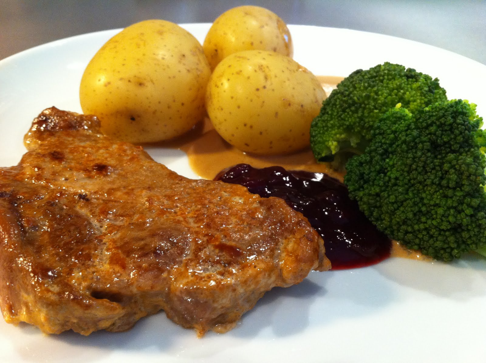 | Skeda över lite sås på köttet. |