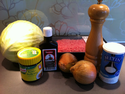 Skär bort roten på vitkålen och skär resten i mindre bitar. Hacka löken. Bryn kålen, på medelvärme, tillsammans med löken i en rejäl klick smör i stekpanna. Kålen ska bli mjuk och glansig. Lägg åt sidan. Bryn blandfärsen i stekpannan. Vänd ned kålen i färsen och blanda samman. Pudra över mjölet (en rejäl matsked). Tillsätt köttbuljong, tomatpuré, gele, salt/peppar och vattnet. Tillsätt lämplig mängd soya. Låt allt stå och puttra till sig en stund. Servera med kokt potatis, lingonsylt eller gelé. Såsen finns redan!