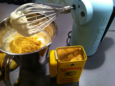 5. Senapsmousse: Vispa upp grädden med sockret. Blanda i resten av ingredienserna. Låt stå och dra en stund i kylen. Vid servering, doppa en matsked i varmvatten. Forma små ägg av moussen, lägg över köttet.