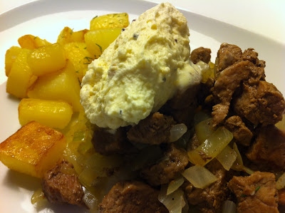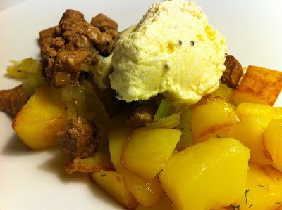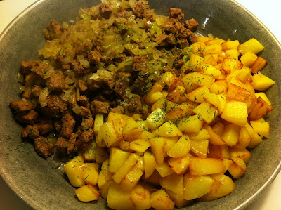 1. Skala potatisen och tärna i 1 cm stora kuber. Råstek potatisen i hälften av oljan och smöret i en stekpanna. Under tiden, skär upp köttet i lika stora tärningar och finhacka löken.