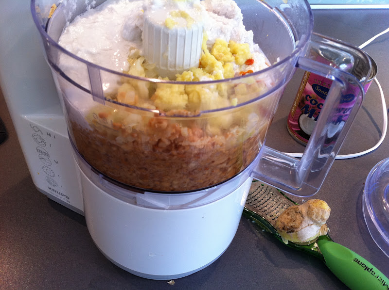 Rosta nötterna under omrörning i stekpanna. Grovhacka dem i en matberedare. Hacka lök och vitlök och fräs glansig i olja. Häll över löken i matberedaren. Tillsätt kokosmjölk och kryddorna. Kör till en grovhackad sås.