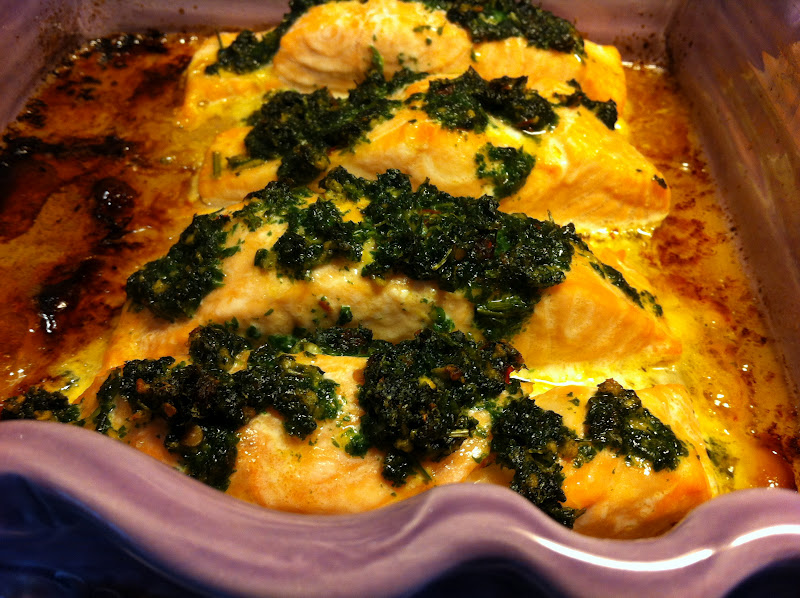 Laxen: Lägg fisken i en smord ugnsfast form. Salta. Blanda resterande ingredienser och fördela på laxbitarna. Stek mitt i ugnen i 225 grader i cirka 15 minuter.